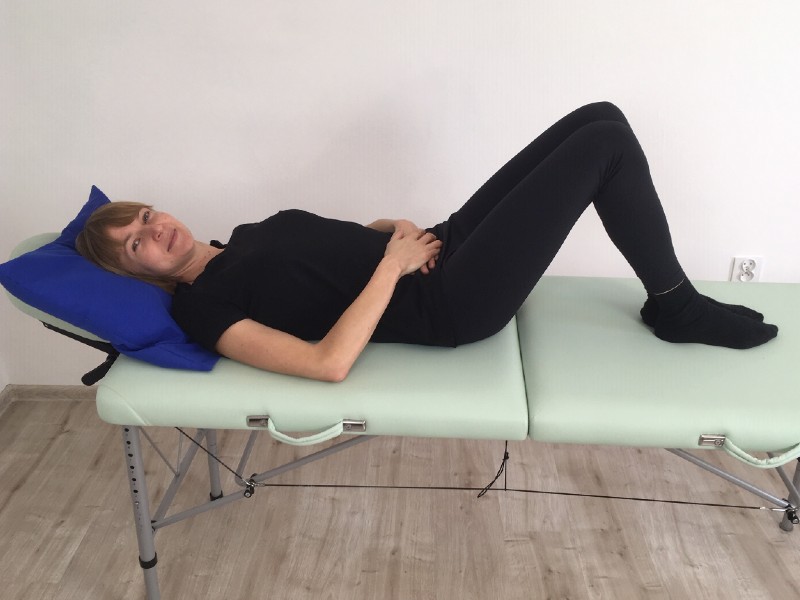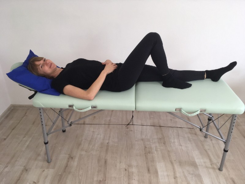 - Nogi ugięte, stopy razem, kolana i uda razem lekko dociśnięte. Przenoś kolana raz na jedna raz na druga stronę. Najpierw w małym, później w coraz większym zakresie.